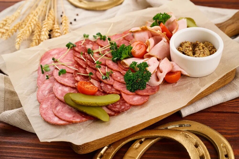 Грудинка свиная, колбаса говяжья, рулет деликатесный, сало по-Белорусски, помидор черри, консервированный огурец.