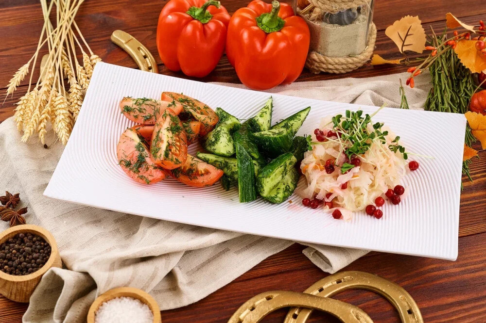 Квашенная капуста, красная маринованная капуста, огурец консервированный, паттисон консервированный, перец зеленый маринованый, помидоры консервированные.