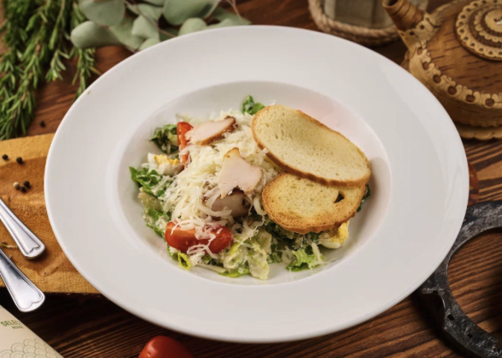 Салат романо,помидор черри,перепелиное яйцо,сыр пармезан,соус цезарь,гренки из белого хлеба,куриное феле.