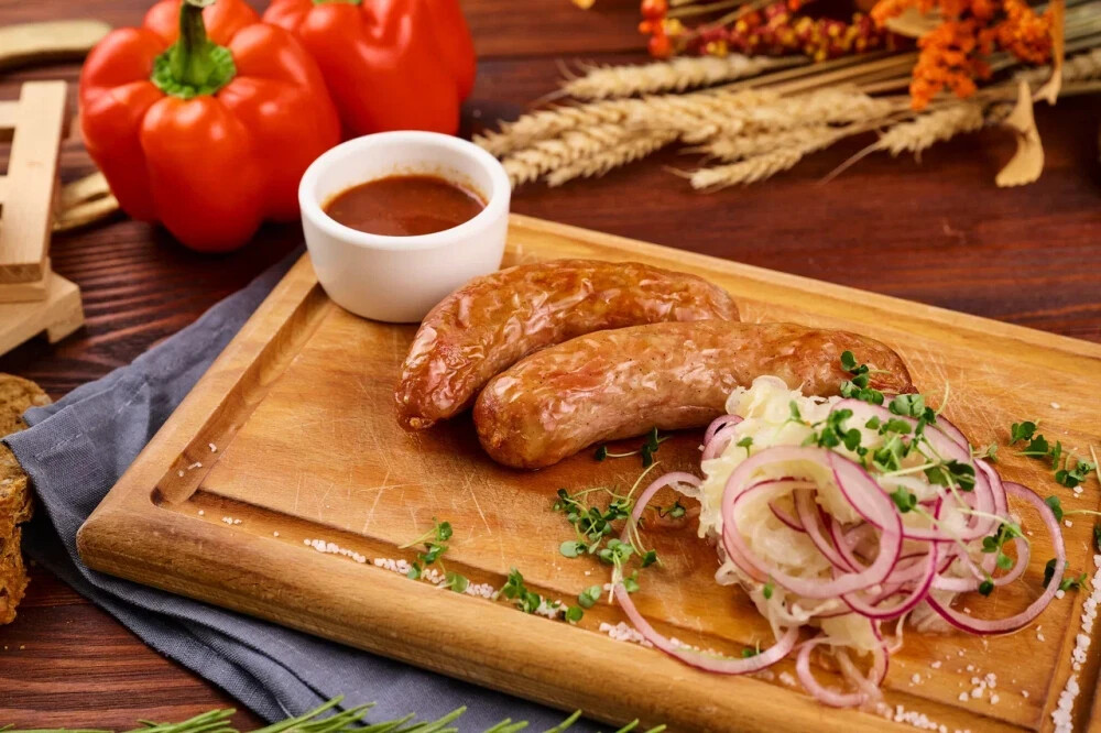 Свиная колбаска с квашеной капустой и огурцом