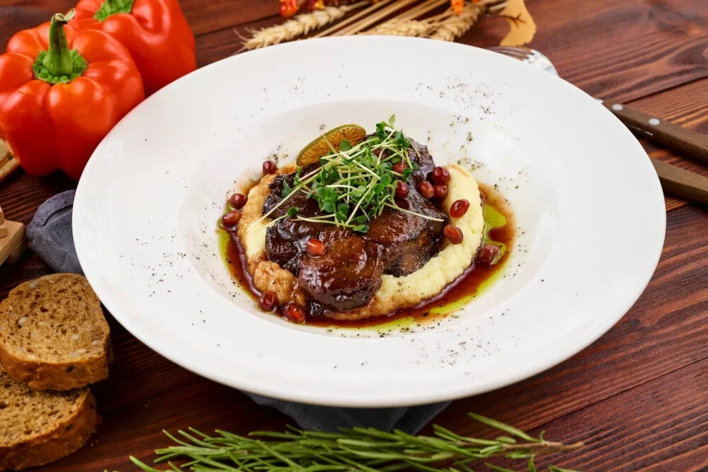 Шея свинины, гранатовый соус, пюре картофельное с копченым сыром.