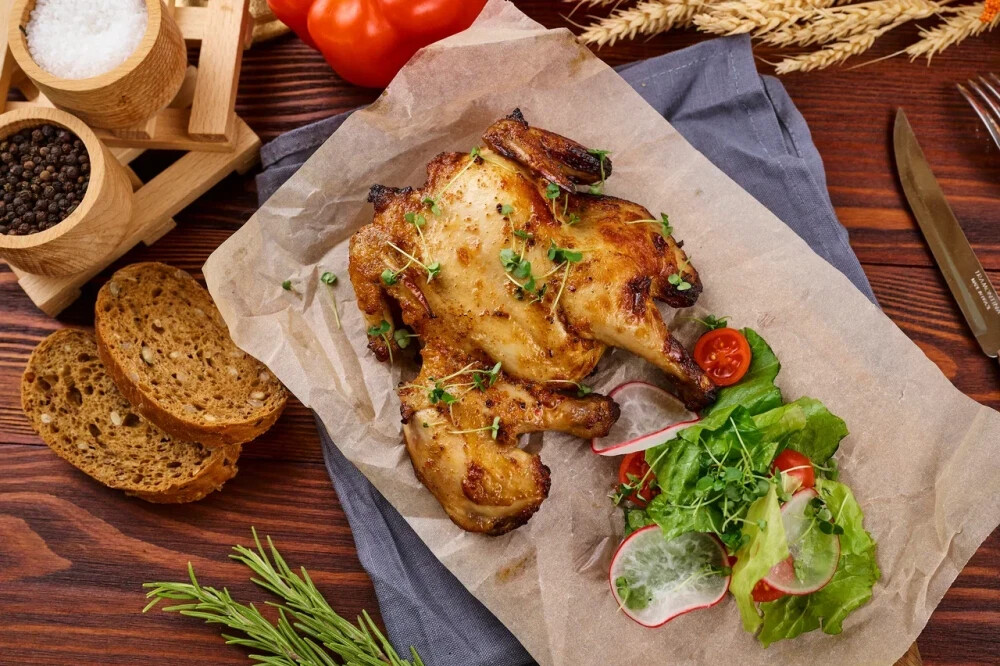 Цыпленок корнишон с соусом из рубленных томатов черри с зеленью