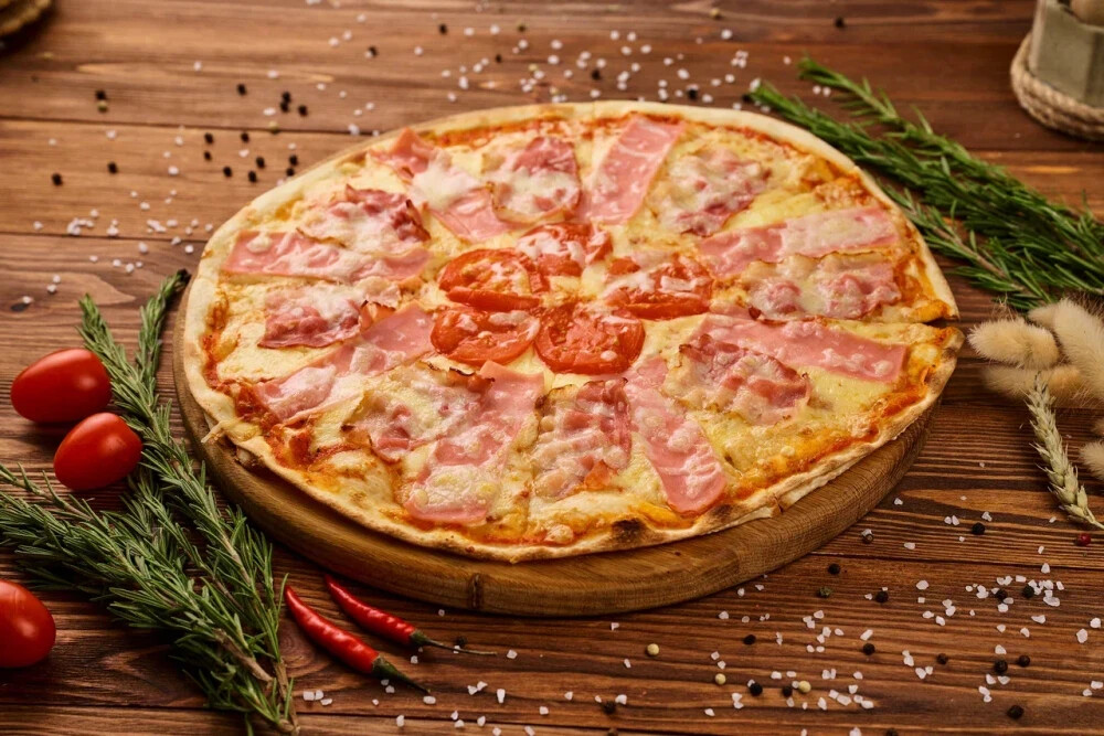 Тесто для пиццы, помидоры свежие, ветчина, бекон, сыр моцарелла, сыр пармезан, соус томатный для пиццы