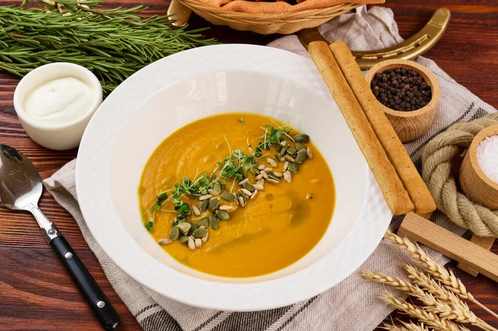 Тыквенное пюре, молоко кокосовое, семя тыквы, семя подсолнечника, хлеб гриссини, масло зеленое