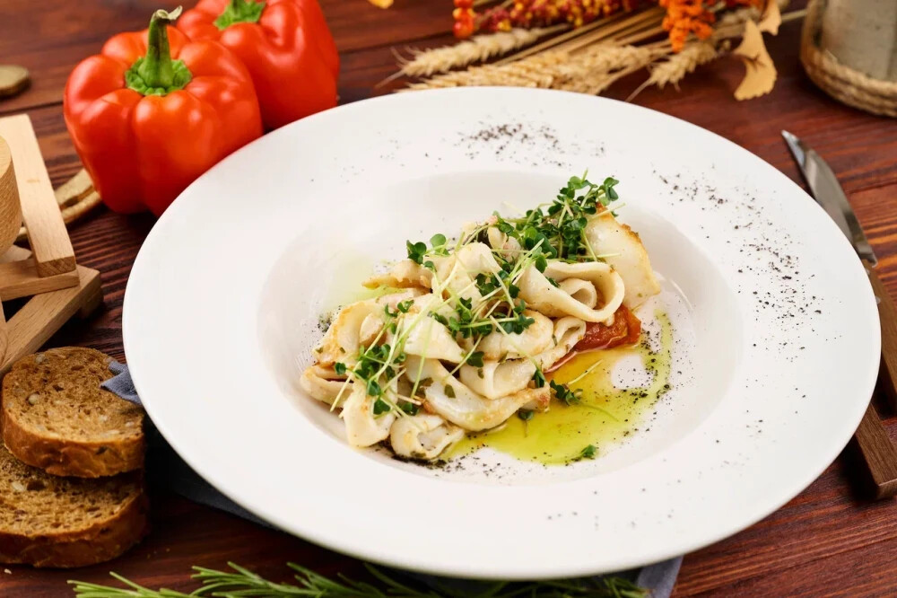 Кальмар, помидоры свежие, соус чимичури, соль, масло растительное, масло чесночное, вино белое