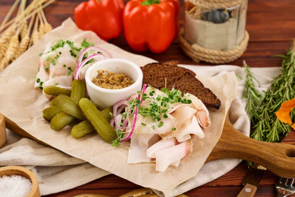 Шпик по-Белорусски, редис, огурцы консервированные, горчица зерновая, хлеб бородинский, лук зеленый